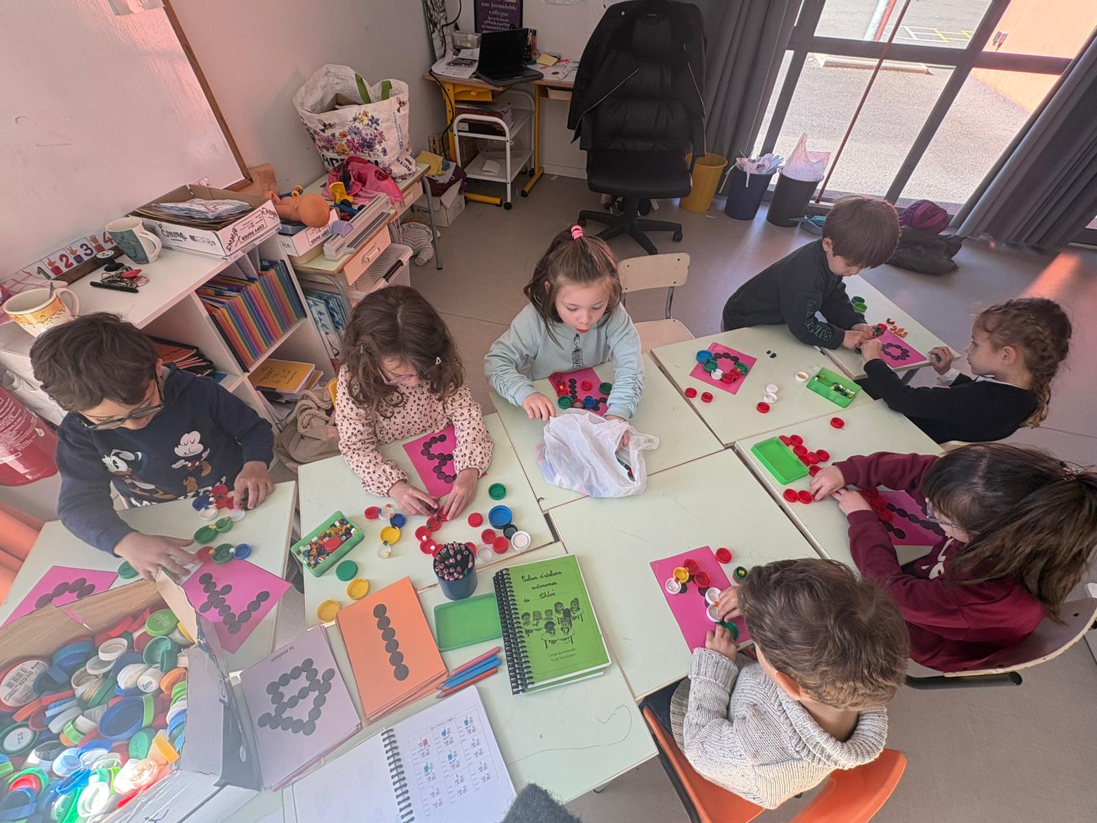 Nous avons travaillé les clip-it, lettres et chiffres ont pris forme avec les bouchons.